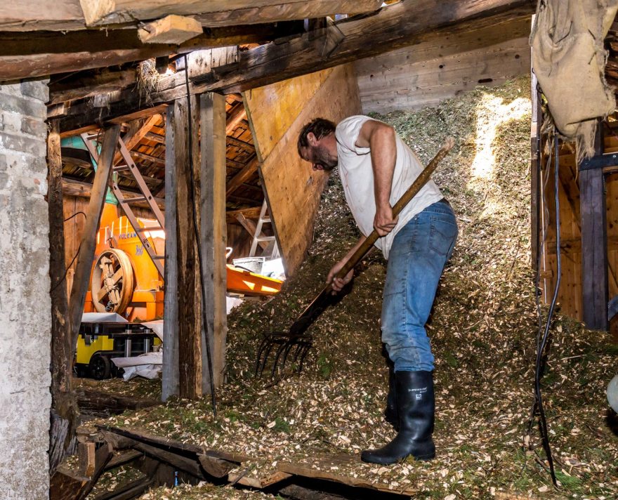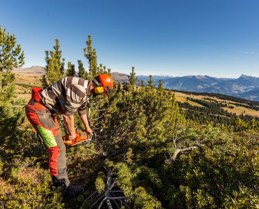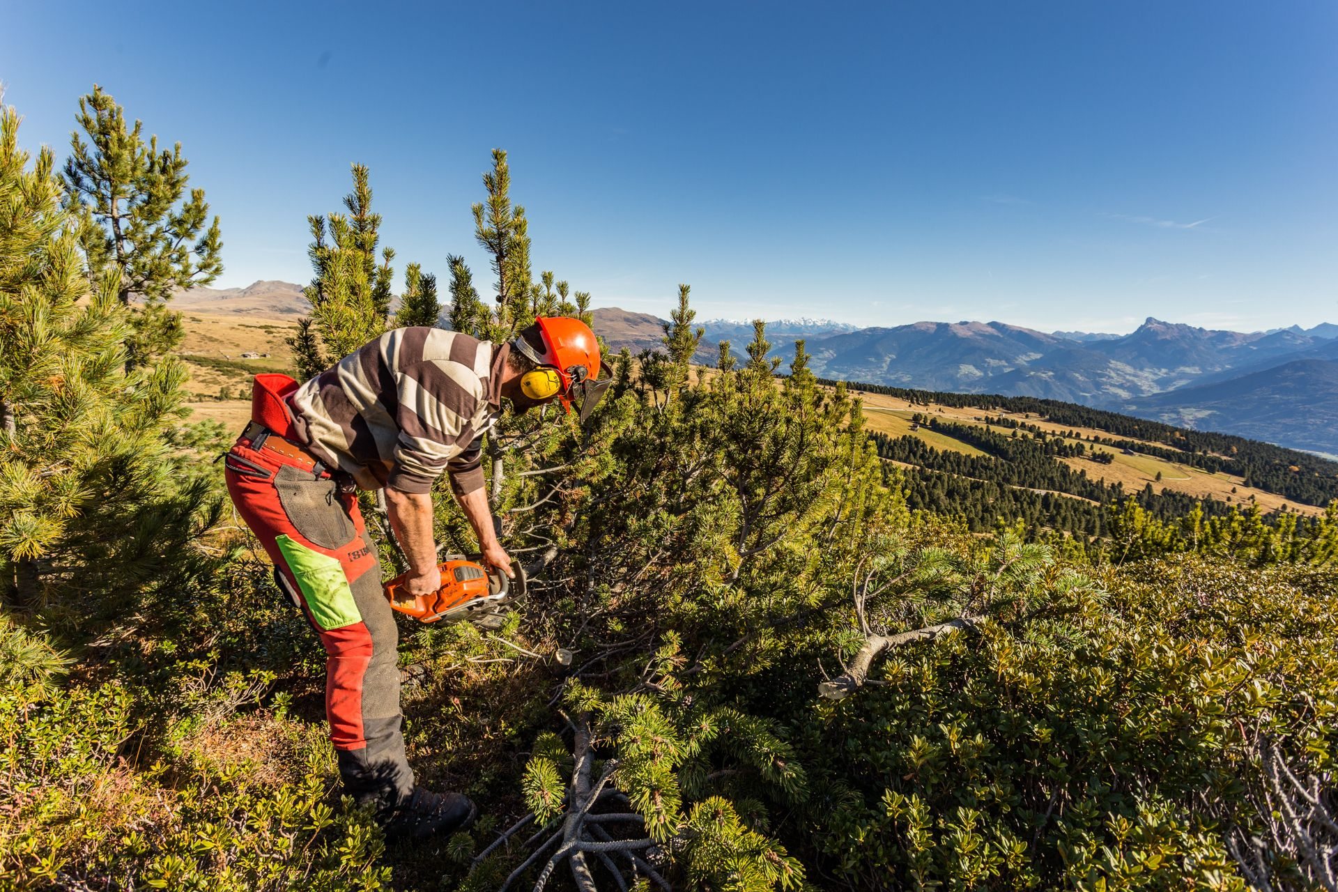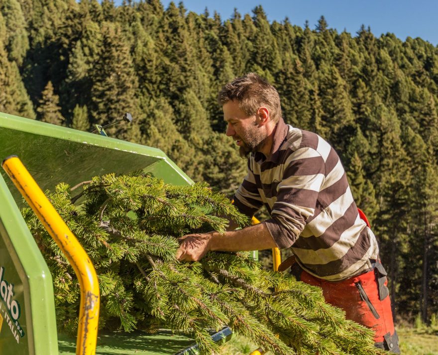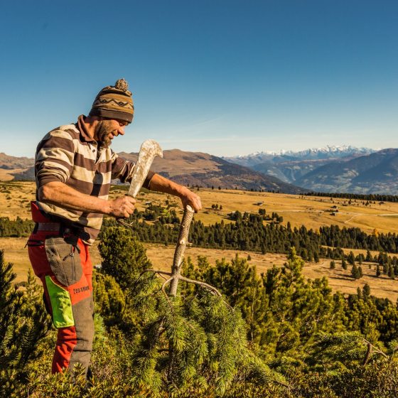 Im Frühjahr und im Herbst schlägern wir die wildwachsenden Zirbel- und Latschenkiefer auf der Barbianer Alm. Es wird dabei schonend vorgegangen, damit ihr Bestand erhalten bleibt. Anschließend werden die Zweige und Äste im Freien für ca. zwei Wochen liegen gelassen. Danach werden sie kleingehächselt, damit sich bei der Wasserdampfdestillation die Öle besser lösen