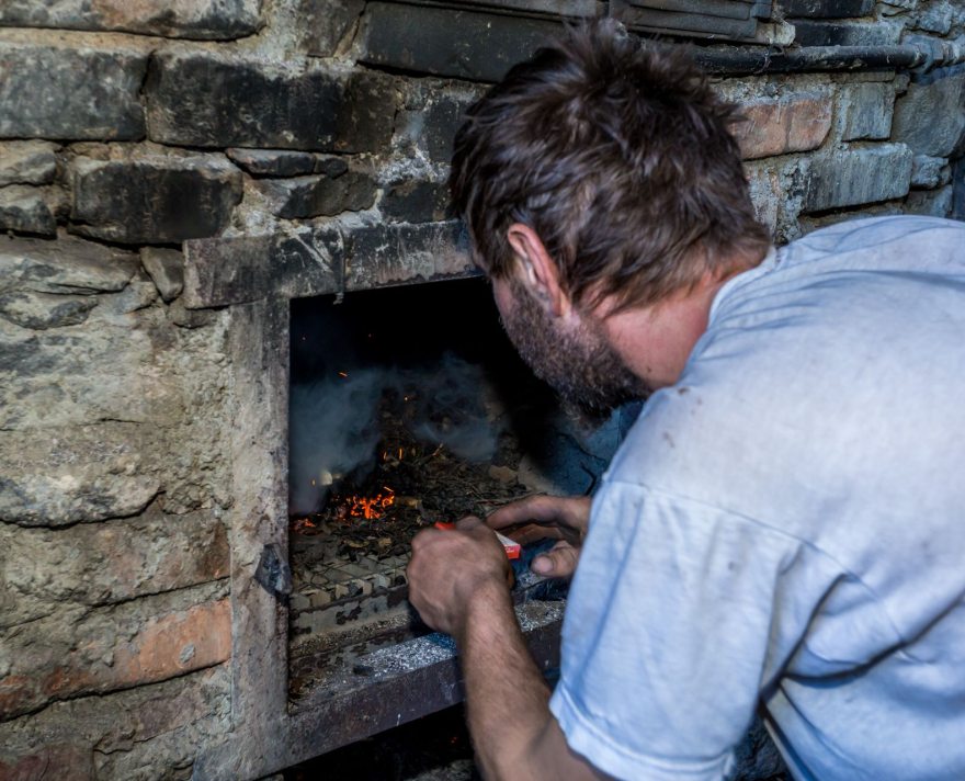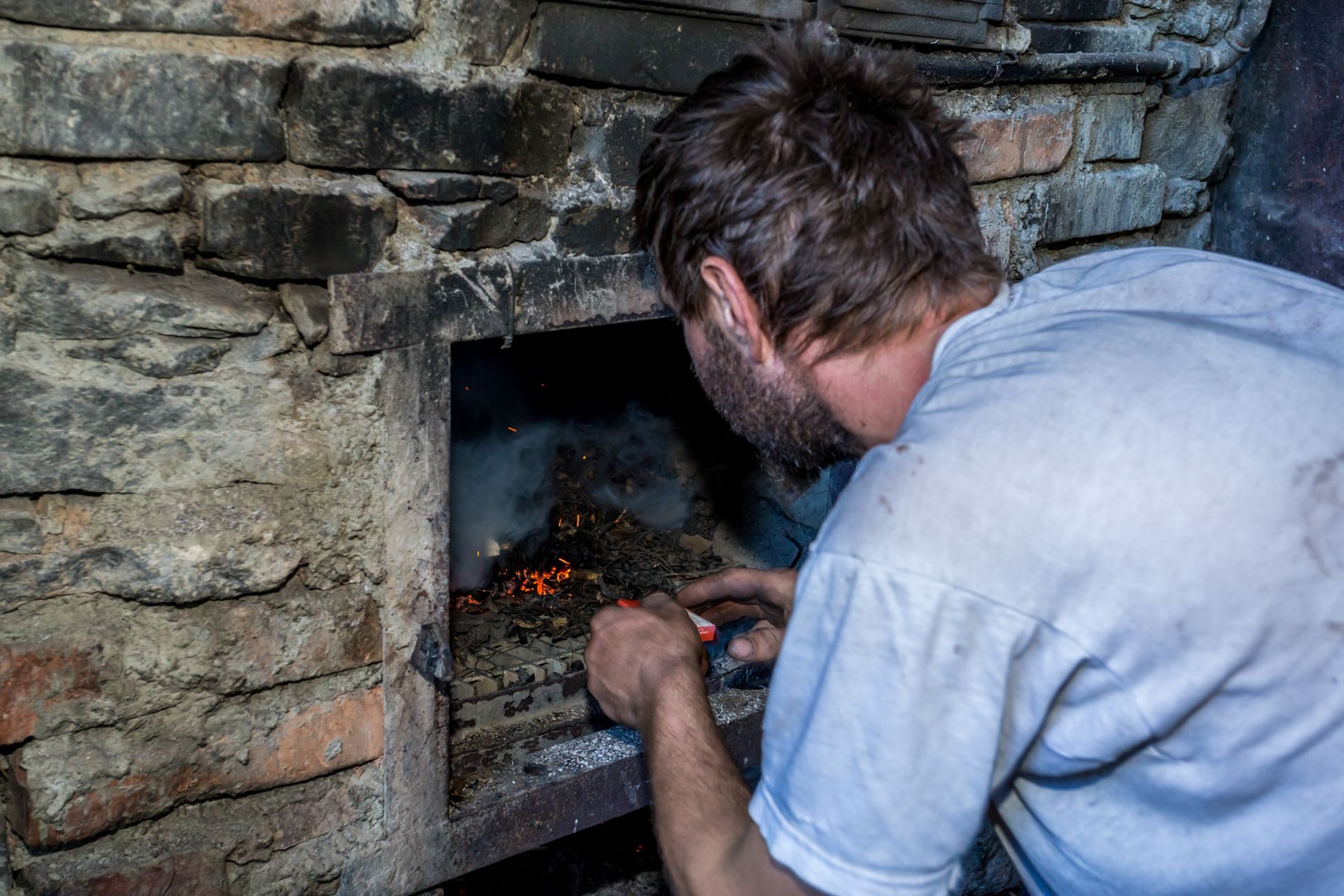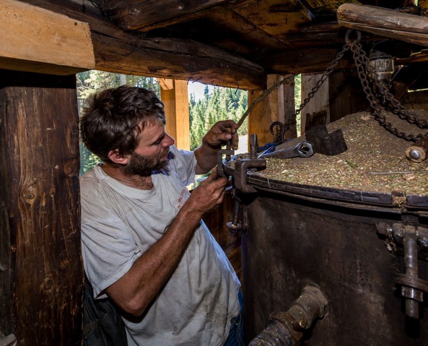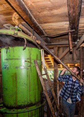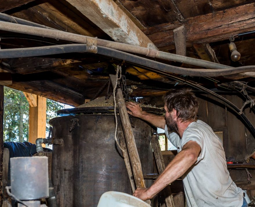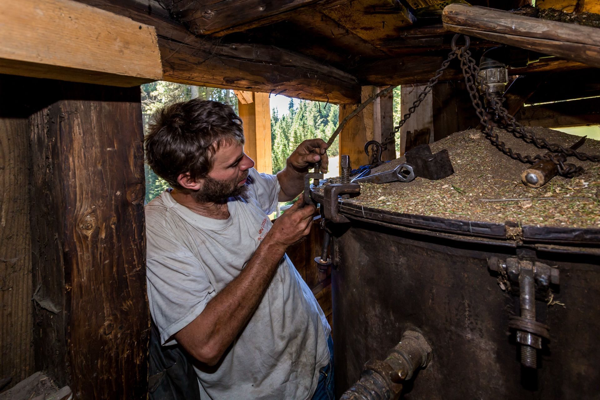 Da es für die Destillation viel Dampf braucht, muss der Ofen ständig eingefeuert werden. Das Wasser darüber fängt zu kochen an und bildet Dampf. Dieser wird von unten dem Destillationskessel zugeführt und steigt nach oben auf. Beim Aufsteigen lösen sich die Öle aus den Nadeln und den Ästen.
