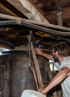 Mit dem Traktor transportieren wir das zerhackte Material in die Brennerei, dort wird es entladen. Ist der Kessel randvoll muss er nur noch fest verschlossen werden, damit der Dampf später nicht entweichen kann.